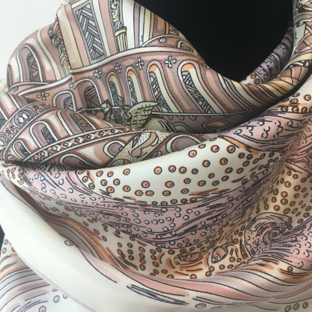 Hodvábna šatka Tower of Babel zo 100% hodvábneho twillu odkazuje na biblický príbeh o Babylonskej veži ako snahy ľudstva spojiť pozemský ťivot s nebesami. Podľa histórie príbehu Boh poplietol ľudom jazyky, aby sa nemohli dohovoriť a ukončili stavbu veže, ako symbolu ľudskej pýchy. Príbeh na šatke ukrýva množstvo zaujímavých detailov, ktoré budete neustále objavovať. Podklad v jemne béžovom odtieni a dokonalá kombinácia staroružových , maslovo krémových a levandulových odtieňov robí z tejto šatky jedinečný hodvábny skvost. Určite Vás prekvapí, aká úžasná je v skutočnosti. Šatka má ručne rolovaný okraj a dodáme Vám ju v elegantnom darčekovom balení.